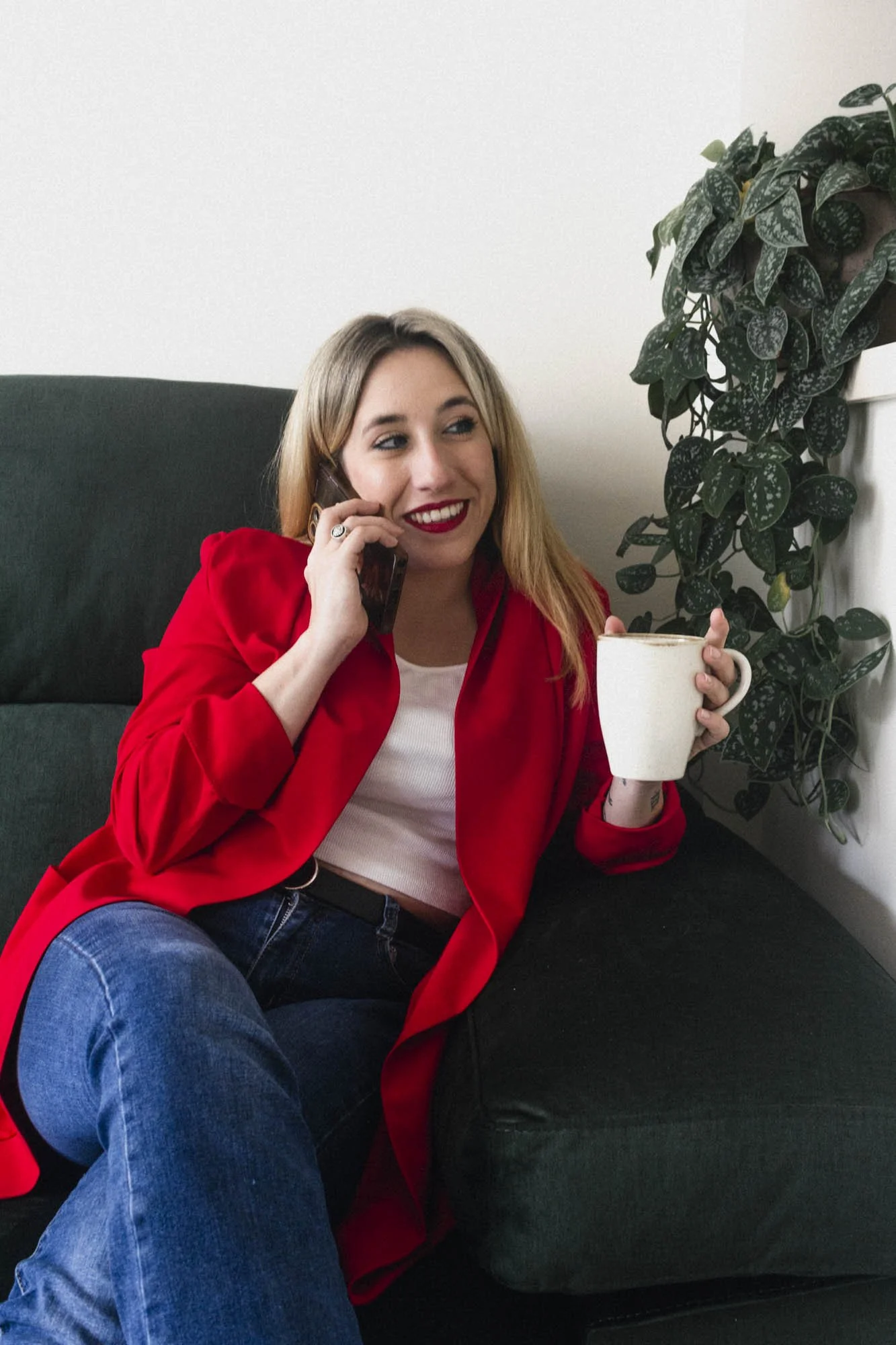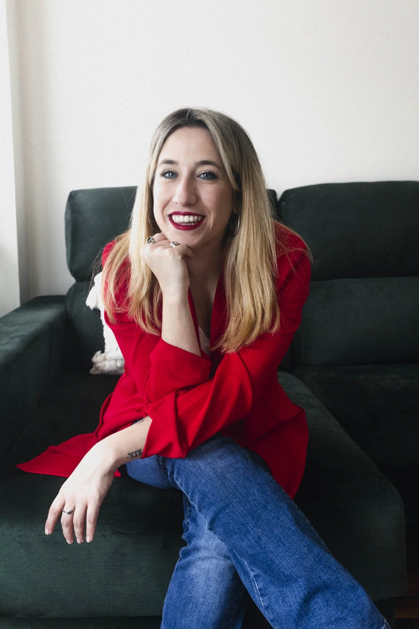 A smiling blonde girl wearing a red jacket, sitting on a green sofa with her legs crossed.