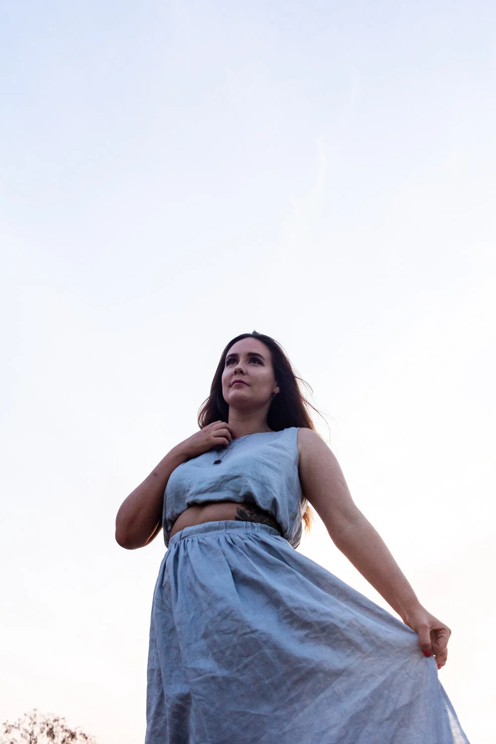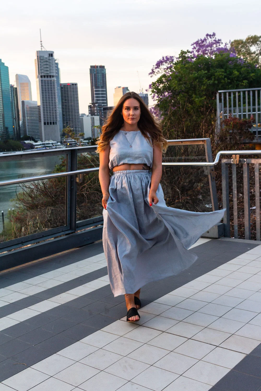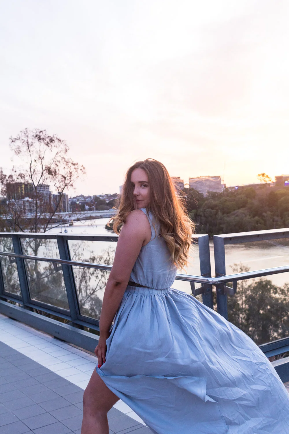 Women wear a blue dress in sunset moment. Brisbane, Australia.