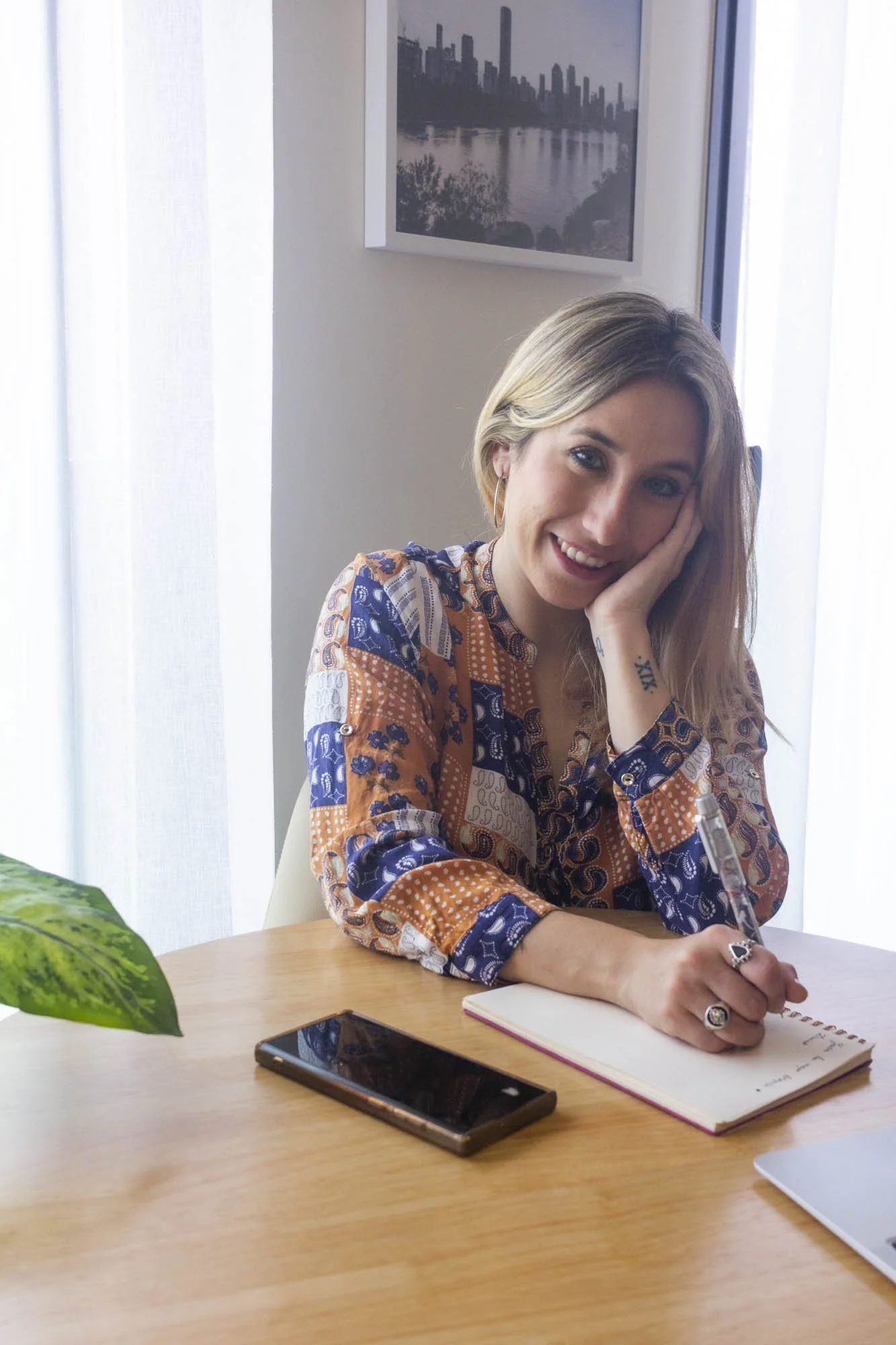 a blonde girl sitting at her desk at work writing in her notebook. Barcelona, Spain