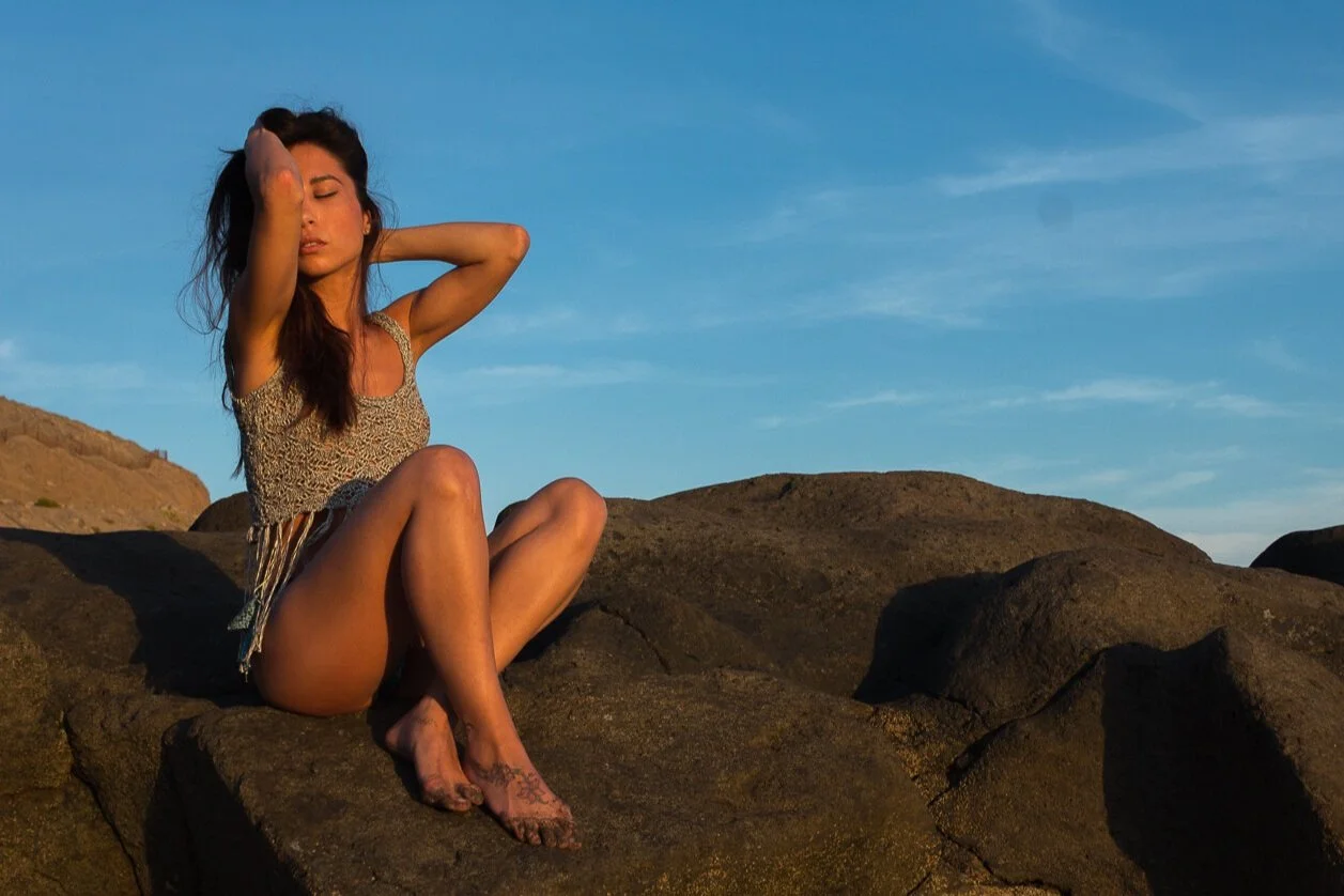 woman sit down on the stone while her arm up. Gran Canaria Spain